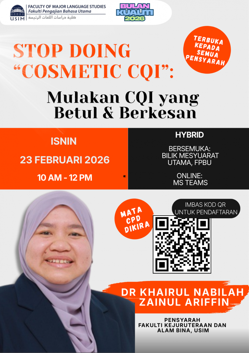 Satu sesi perkongsian ilmiah bertajuk “Stop Doing ‘Cosmetic CQI’: Mulakan CQI yang Betul & Berkesan” telah diadakan pada 23 Februari 2026 (Isnin), jam 10.00 pagi hingga 12.00 tengah hari secara hibrid.