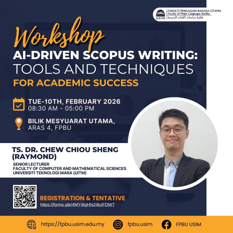 NILAI, 10 Februari 2026 – Fakulti Pengajian Bahasa Utama (FPBU), Universiti Sains Islam Malaysia (USIM) telah menganjurkan Workshop AI-Driven Scopus Writing: Tools and Techniques for Academic Success pada Selasa, 10 Februari 2026, bermula jam 8.30 pagi hingga 5.00 petang.